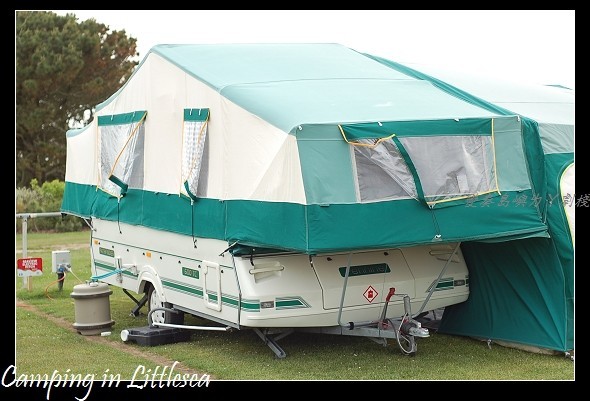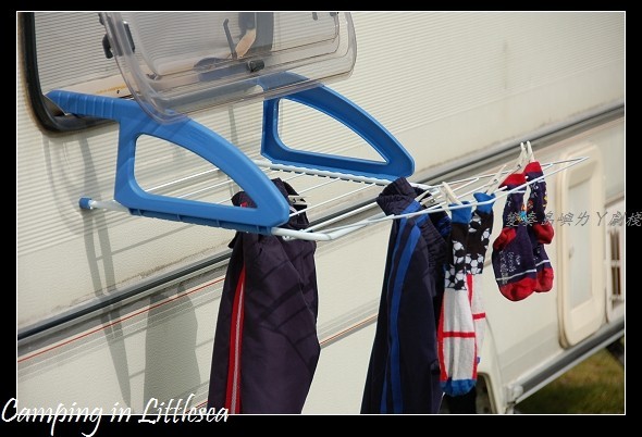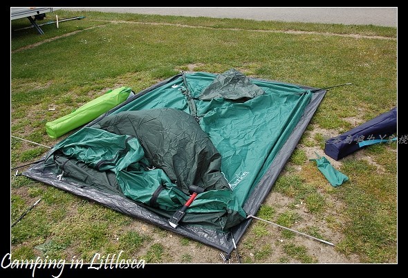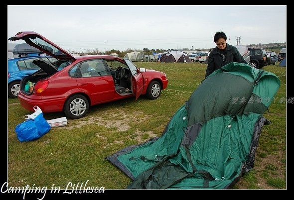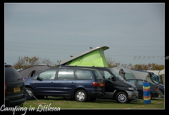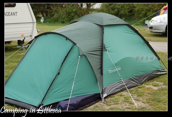 我們的迷你雙人帳和周遭的配備比起來,簡直就是貧民窟.....放眼所及都是豪華版的大型帳棚,或是露營車,由於風很大,所以有些人會多架一個擋風帆布,在入口處圍一圈.