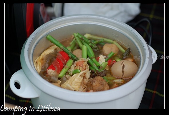 野營的火鍋晚餐.....有當季盛產的蘆筍.番薯粉條.高麗菜乾(老爸的愛心....老爸親自曬乾給我的).豆腐皮.滷蛋.丸子.熱狗.....熱騰騰的....特別暖胃,尤其在這個氣候下......風吹得我好冷啊!!